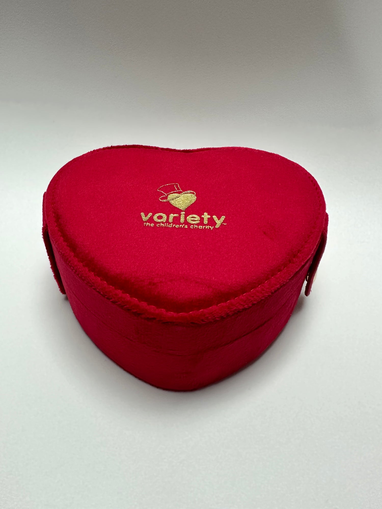 This collection box is a high quality, Variety branded, heart shaped box, with a red velvet finish, that can hold up to 12 Gold Heart pin badges.